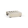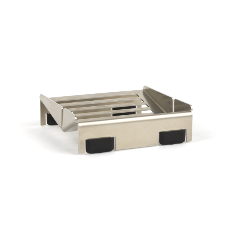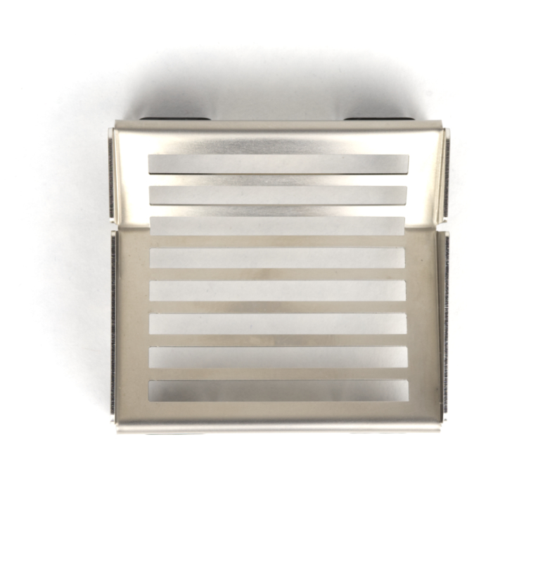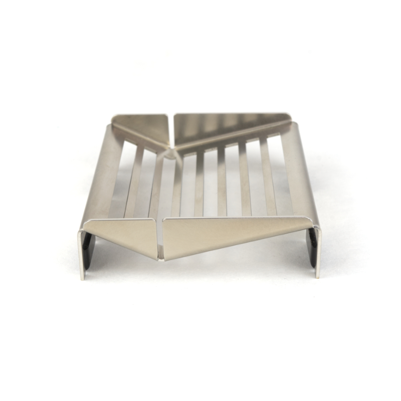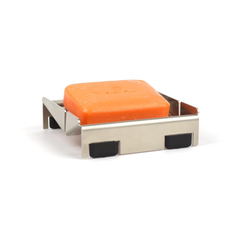 SELMA № 4 ist eine Seifenschale aus geschliffenem Edelstahl. Die Seife liegt bei ihr auf einer außermittig eingeknickten Fläche, die durch freistehende Stege parallel zur langen Seite gebildet wird.