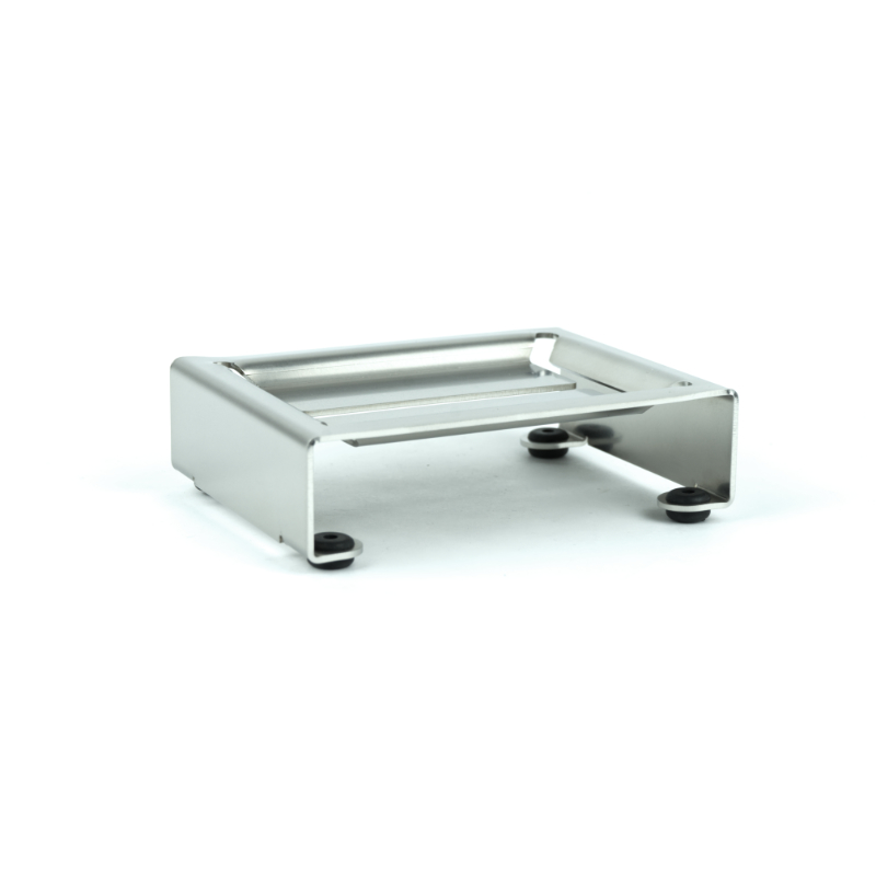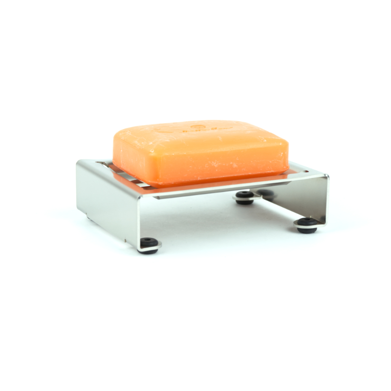 SÖREN № 1 ist eine Seifenschale aus geschliffenem Edelstahl. Die Auflagefläche ist nach unten abgesetzt und weist sich durch Schlitze aus. So die trocknet Seife schnell und haut nicht ab.