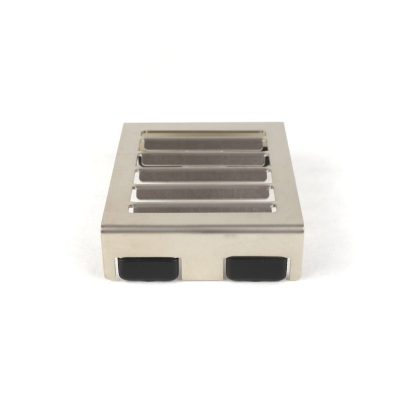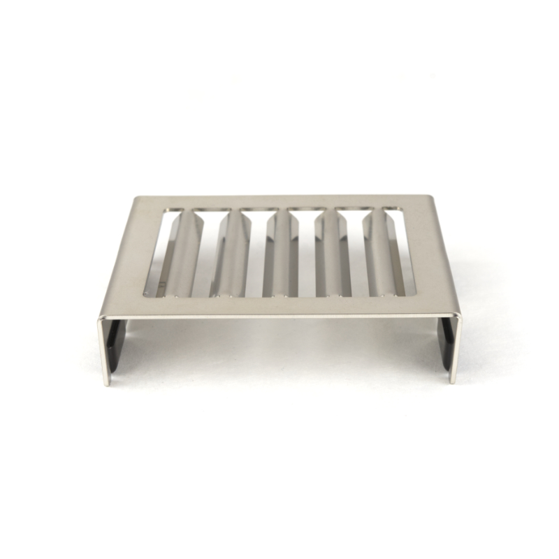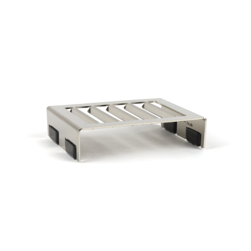 SYLVIA № 4 ist eine Seifenschale aus geschliffenem Edelstahl. Die Auflagefläche hat 6 gekantete Aussparungen quer zur langen Seite, durch die anhaftendes Wasser schnell abgeführt werden kann – wichtig, weil aufgeweichte Seifen kann doch wirklich niemand brauchen!